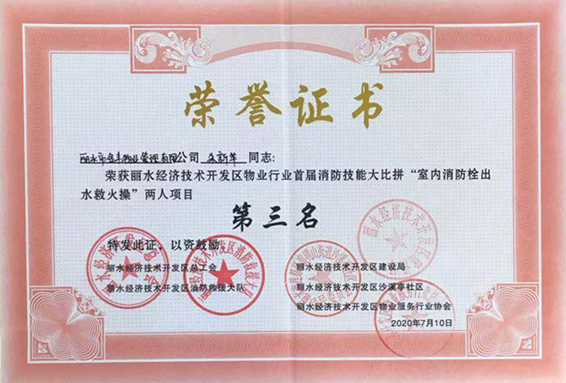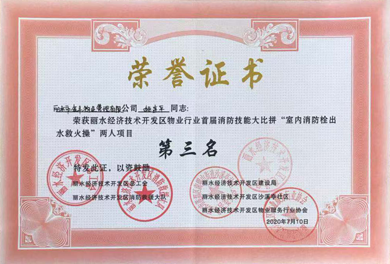 首屆消防技能大比拼“室內(nèi)消防栓出水救火操”第三名 2020-07-23 17:46:05 21 上一篇 : 首屆消防技能大比拼團(tuán)體總分第三名 下一篇 : 首屆消防技能大比拼“兩人兩盤水帶連接”第三名